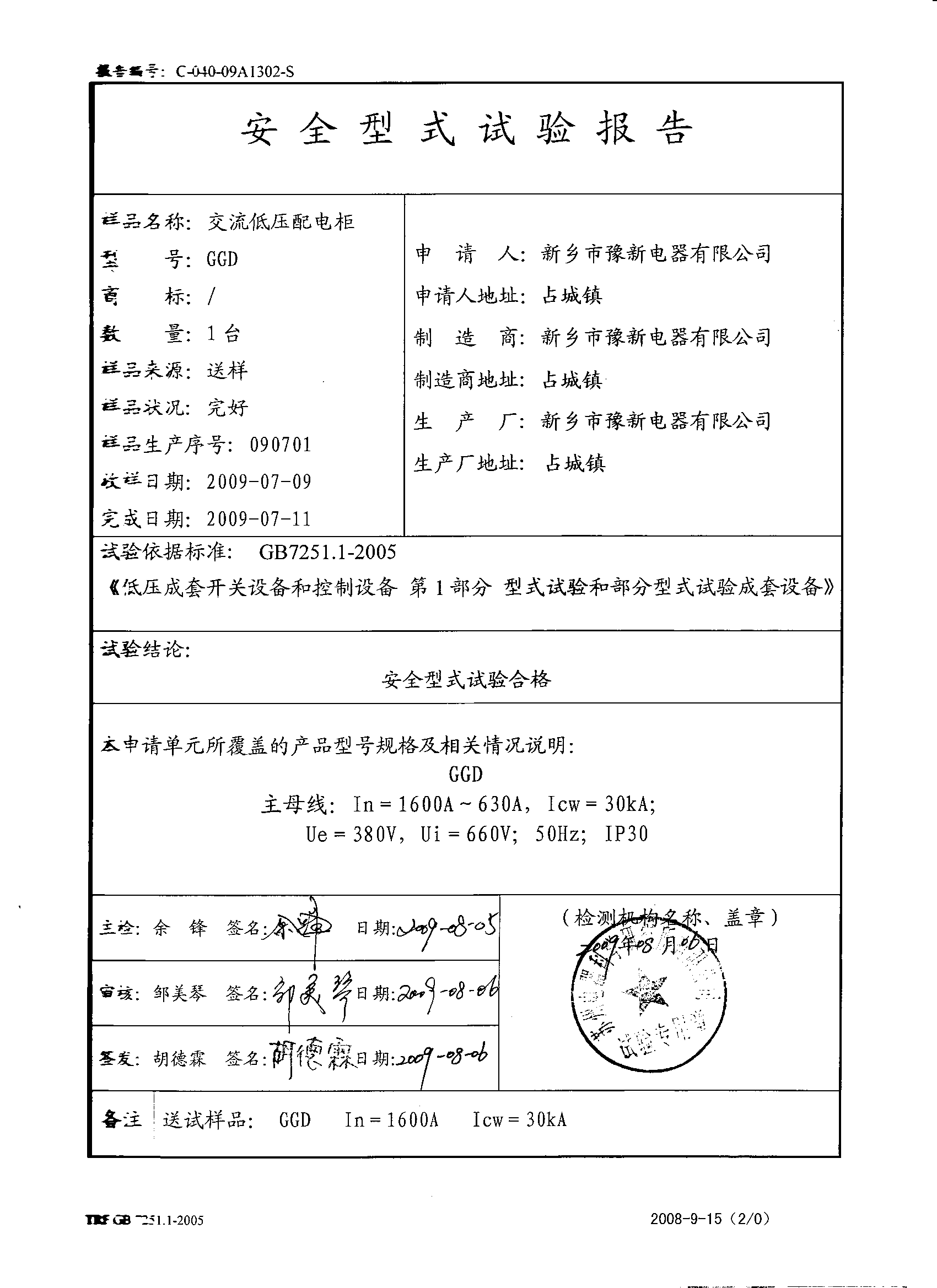 GGD低壓開關(guān)柜檢測報告