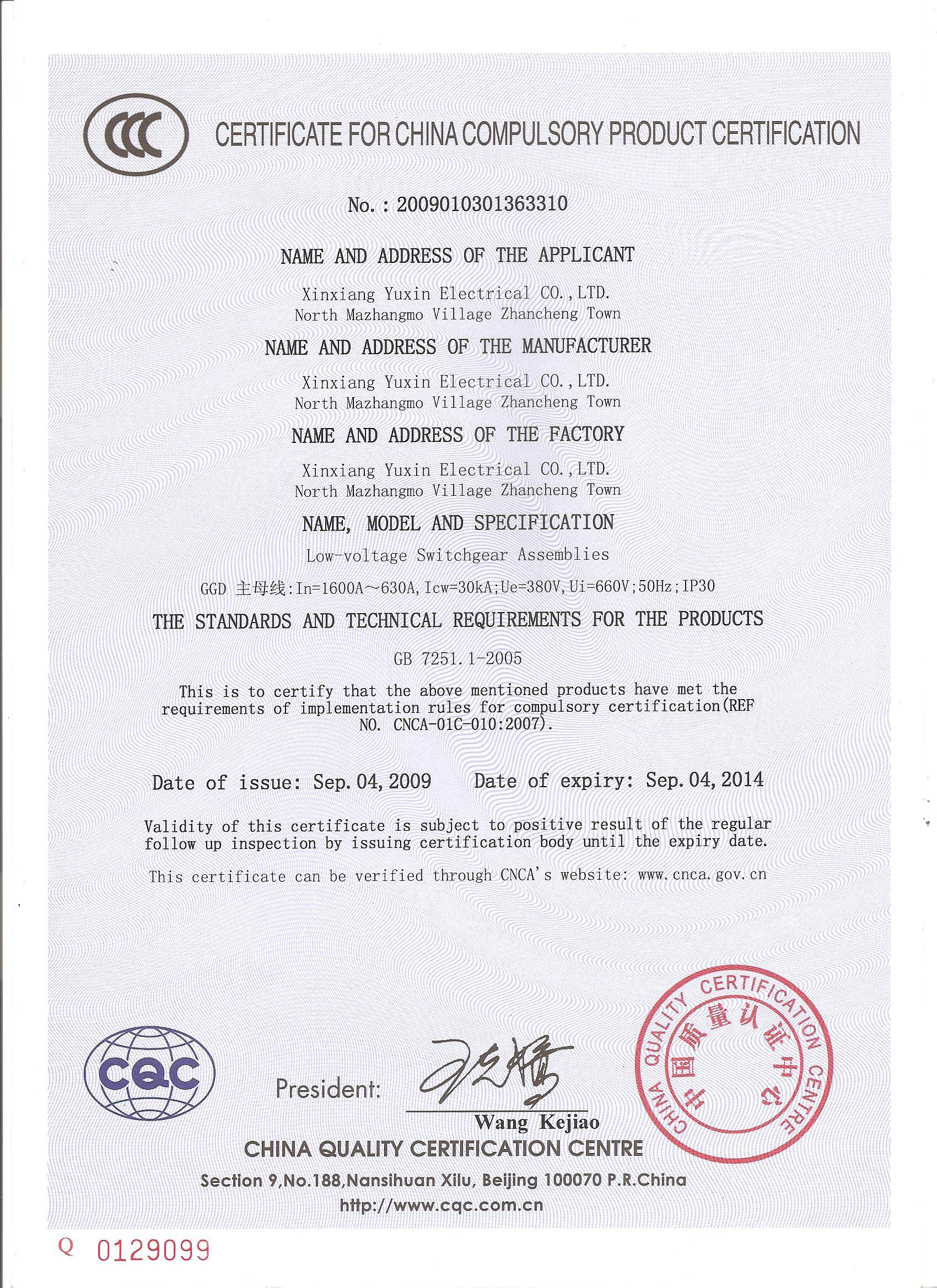 GGD低壓開關(guān)柜3C國家強制認證證書{中}